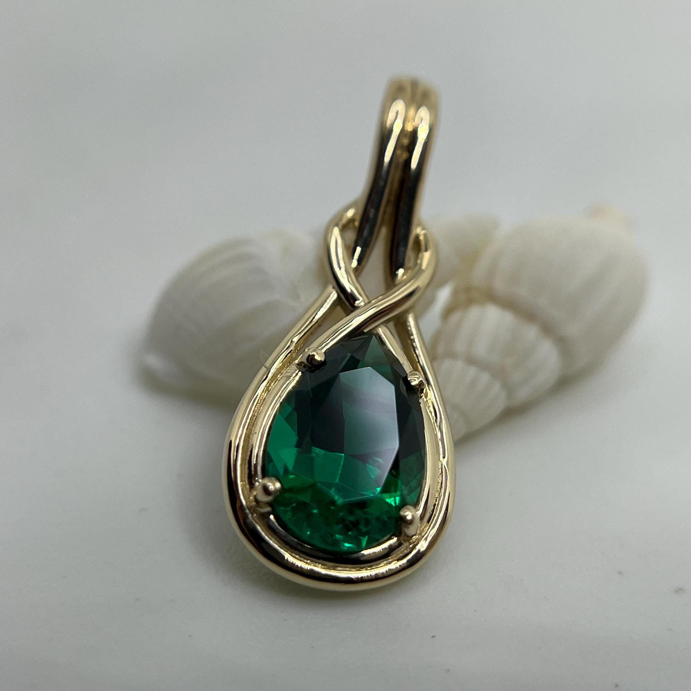 Exceptional and claimed by specialists as the top#1 quality lab grown green emerald gemstone of pear form, installed into unique jewelry weaving design solid 14k gold pendant for necklace.