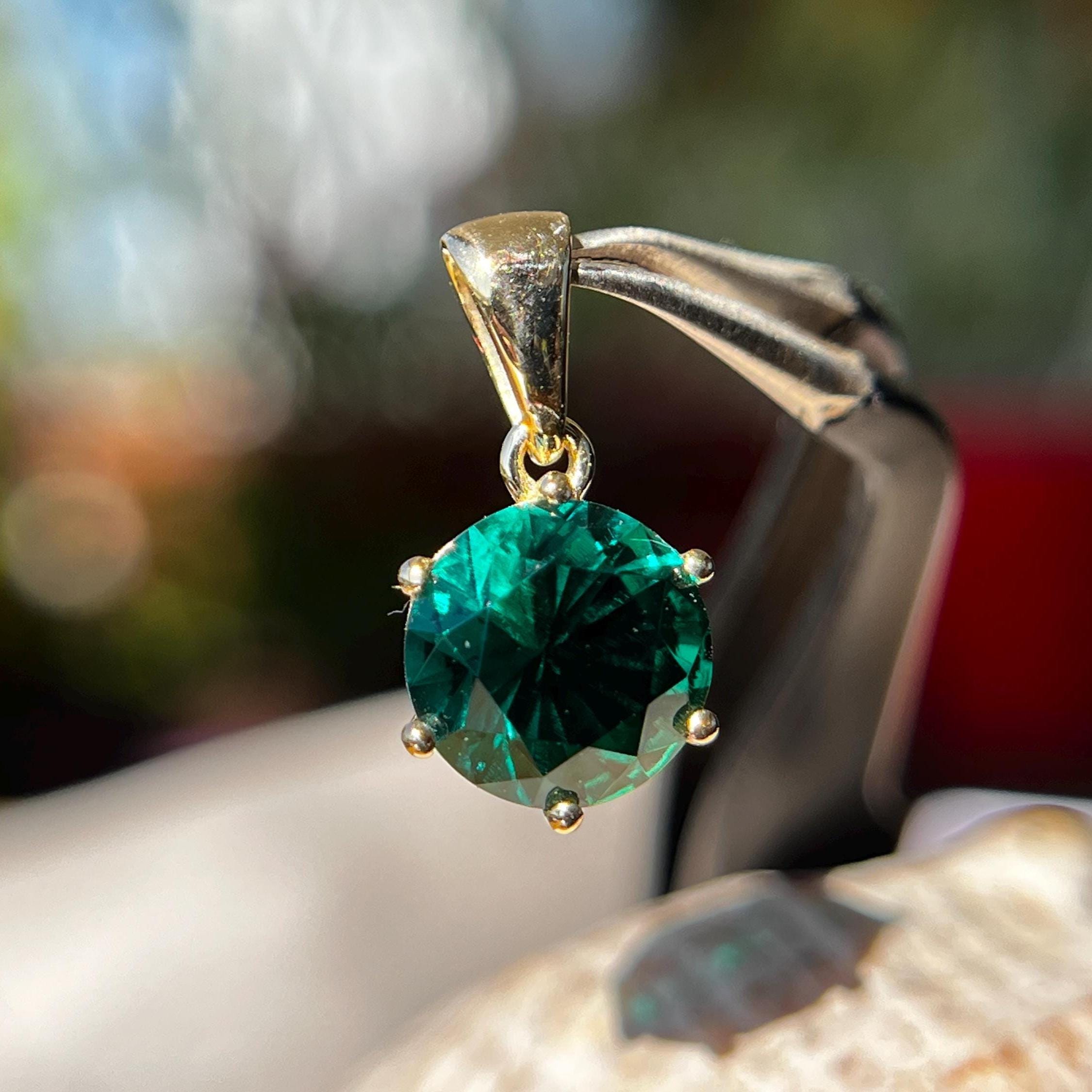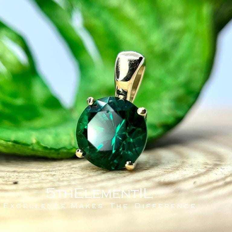 Looking for some minimalist but unique emerald jewelry gift for her? In this listing you have absolutely outstanding quality lab grown emerald gemstone of classic green colour, round brilliant cut, professionally faceted and then installed into solid gold 14k pendant for necklace. Deep classic green as spring grass or as someone eyes that you see once but never forget...