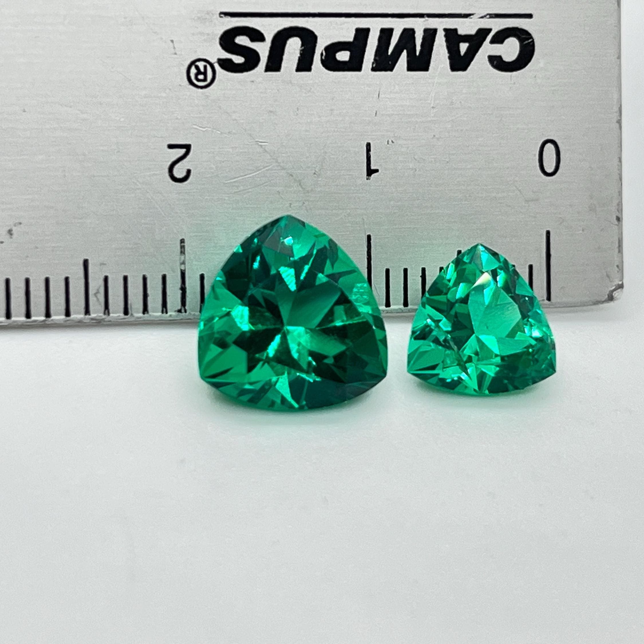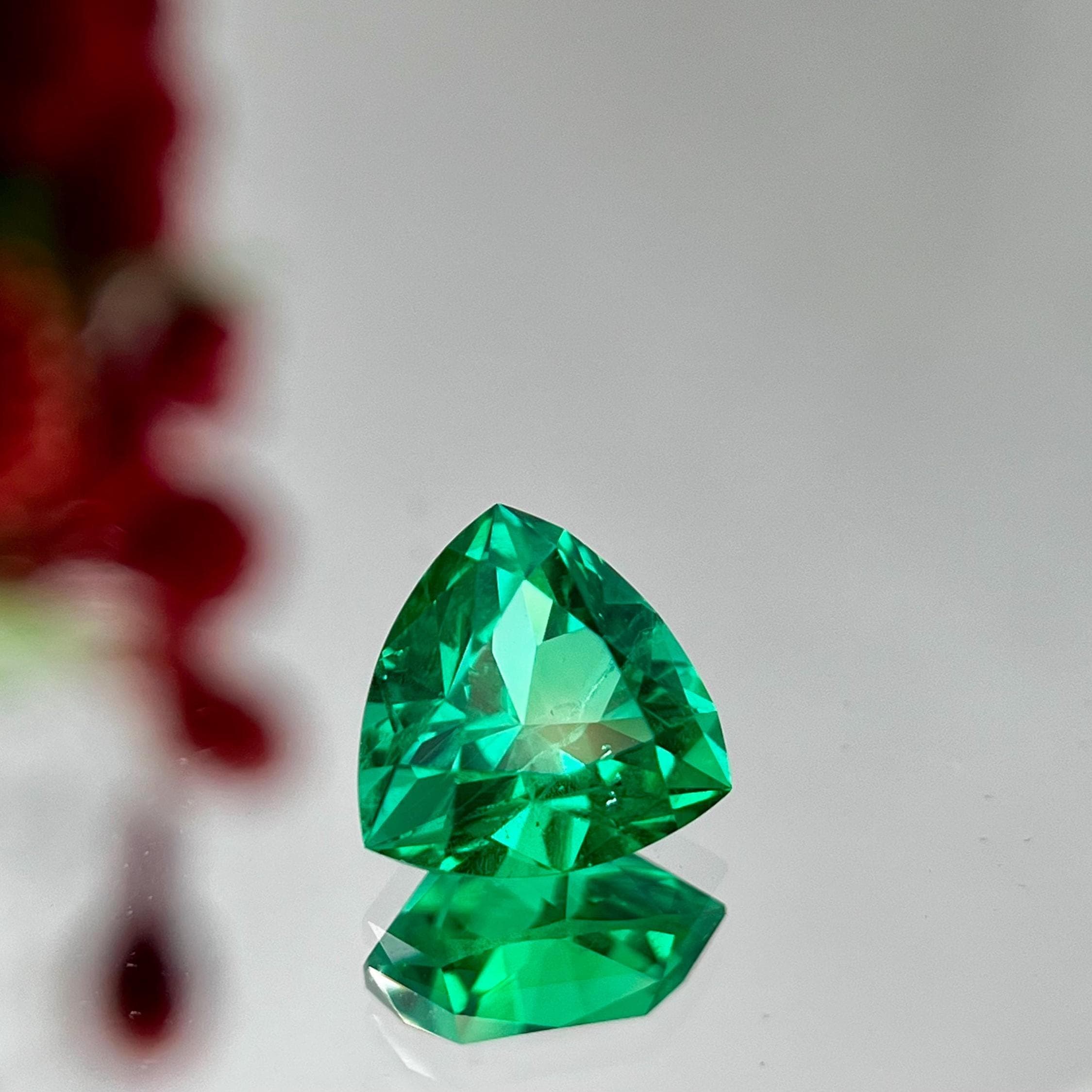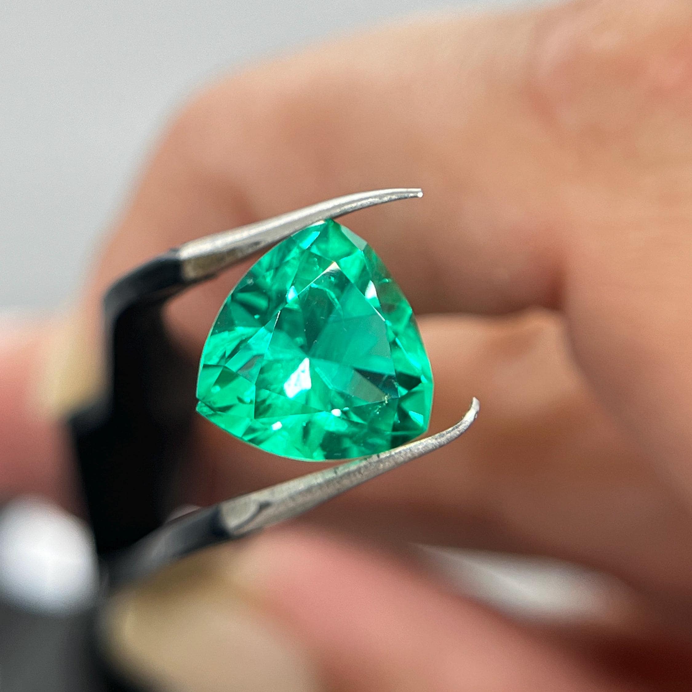 This is premium quality lab grown hydrothermal emerald, trillion cut, colombian bluish-green color which seems to be glowing from inside.