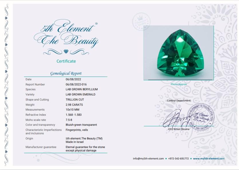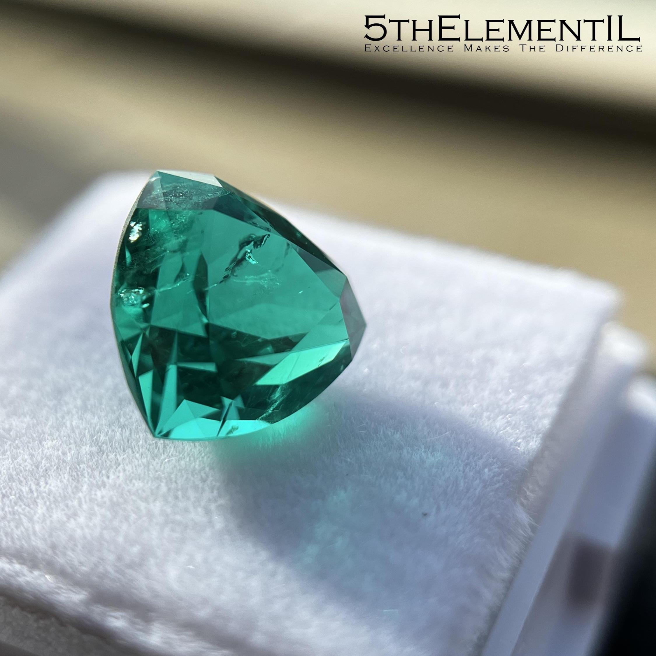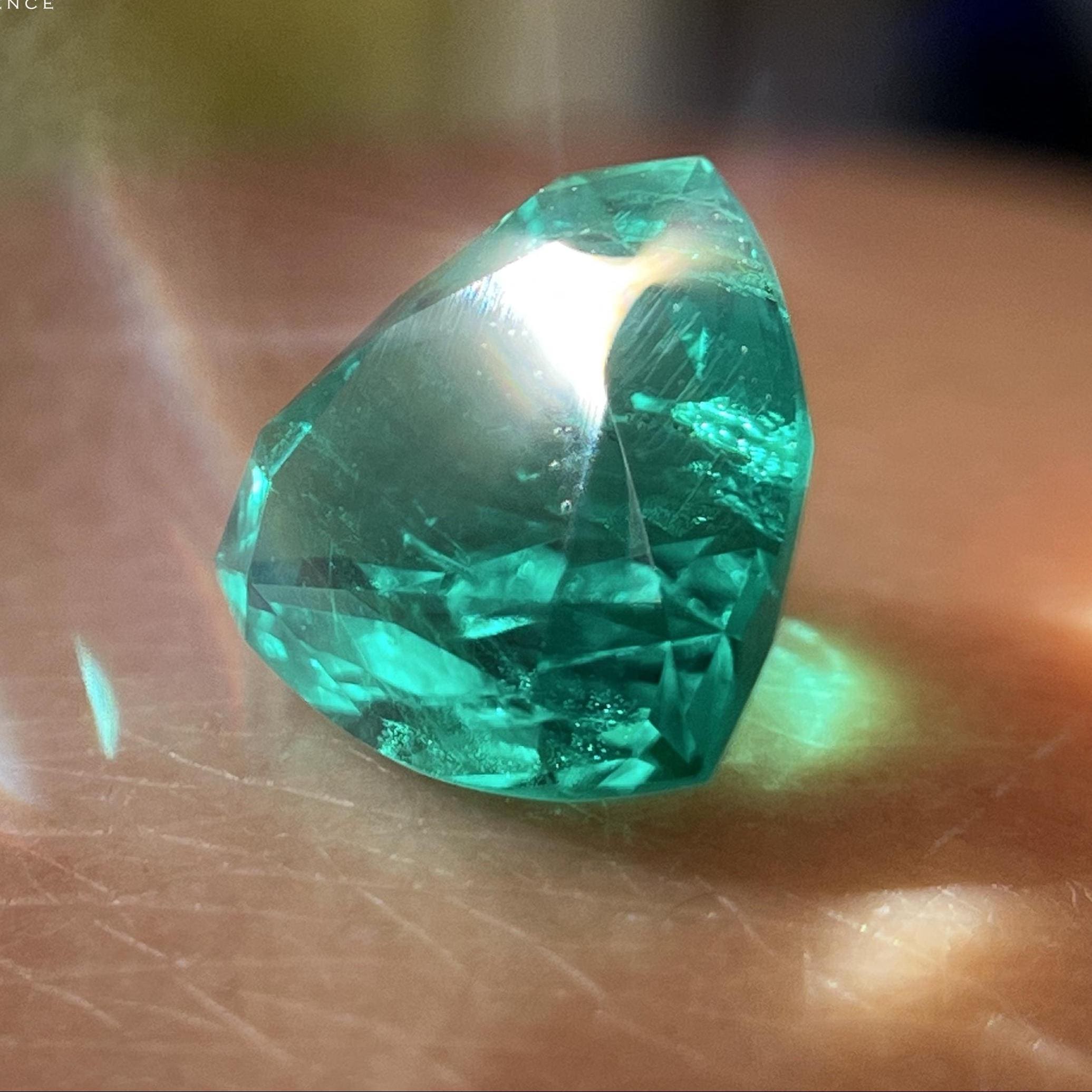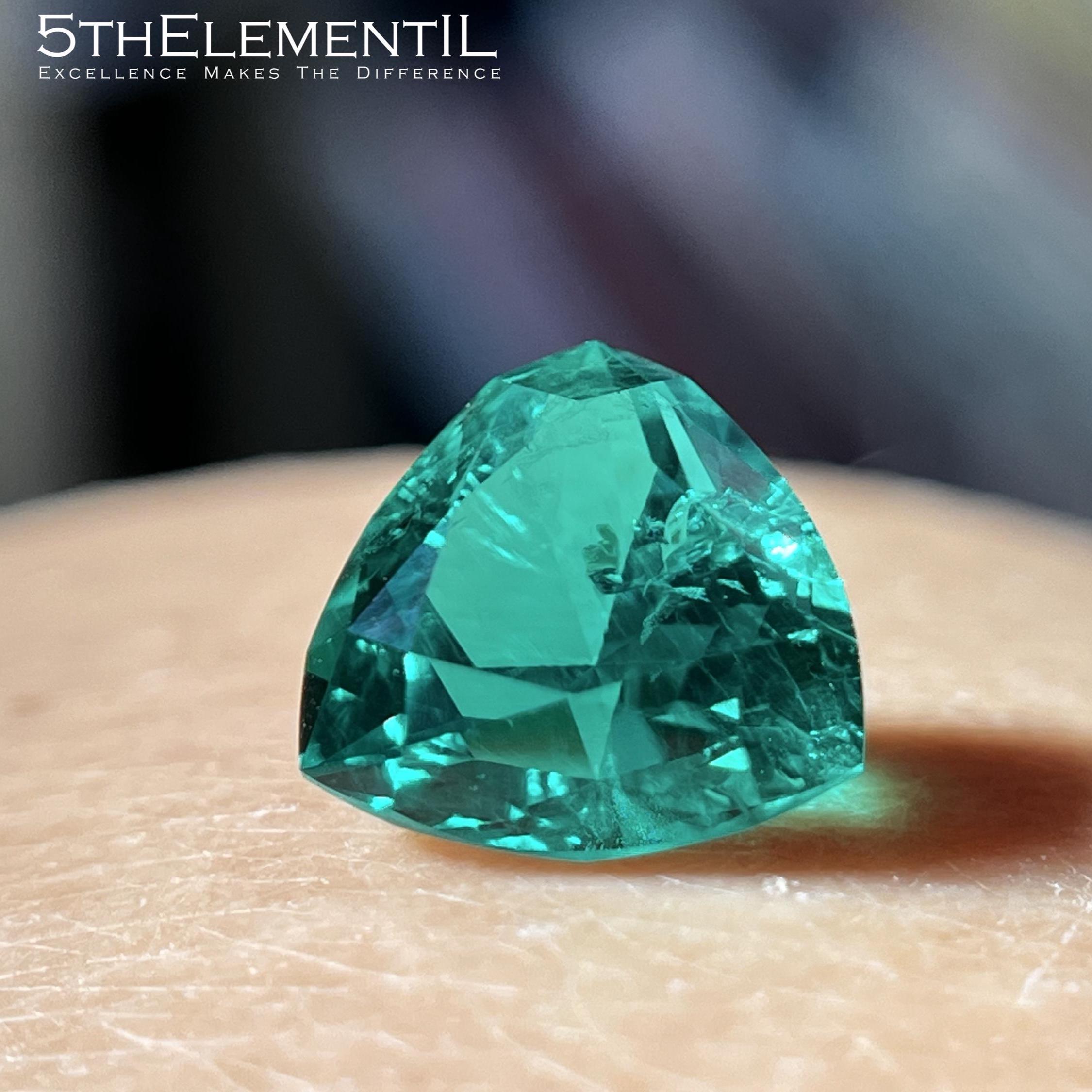 This is premium quality lab grown hydrothermal emerald, trillion cut, colombian bluish-green color which seems to be glowing from inside.