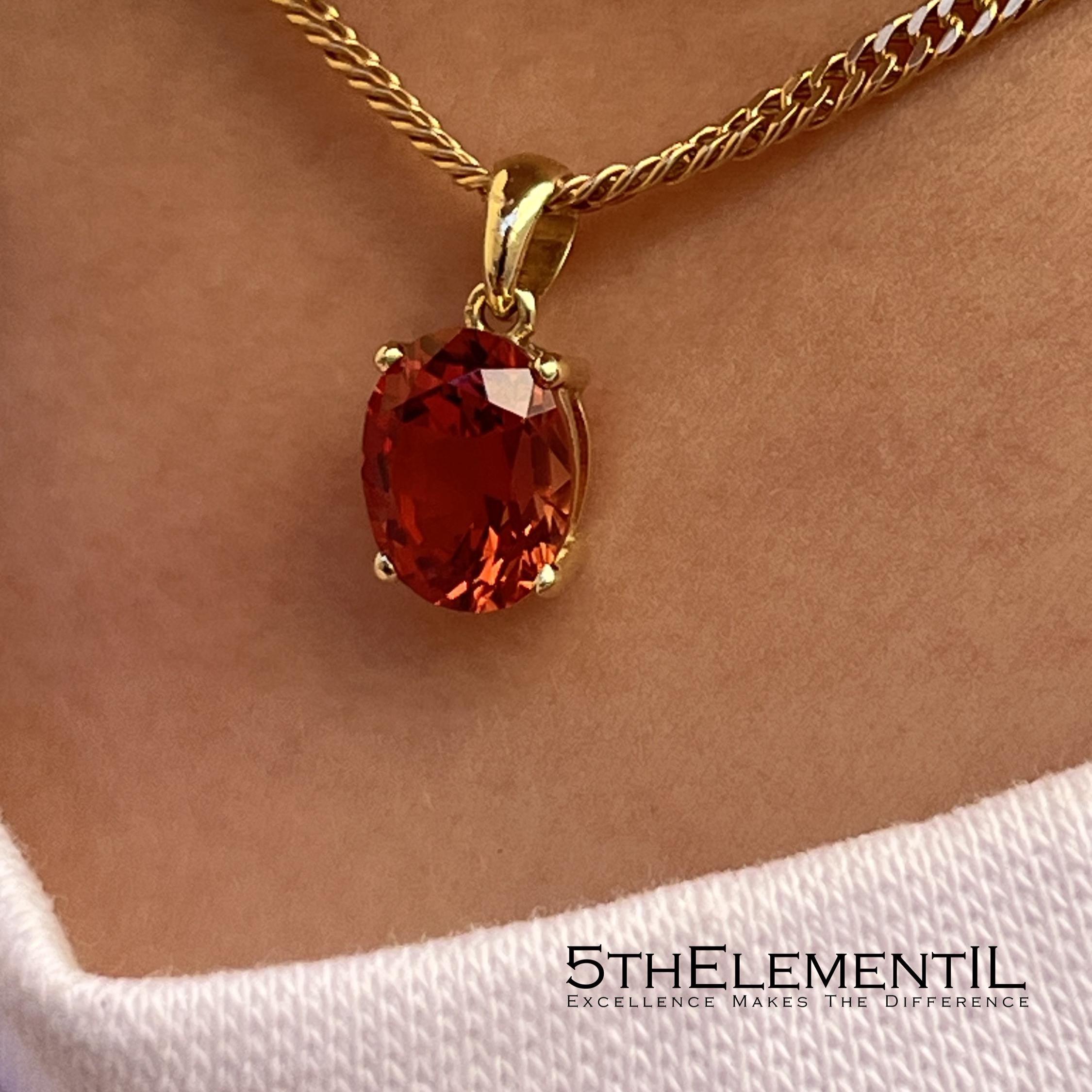 Elevate your jewelry collection with this luxurious, minimalist pendant featuring a stunning 3.58 carat lab-grown Padparadscha sapphire. Set in solid 14K gold (not plated), this oval-cut gemstone radiates a rare blend of pink and orange hues, famously known as the “sunset sapphire.”