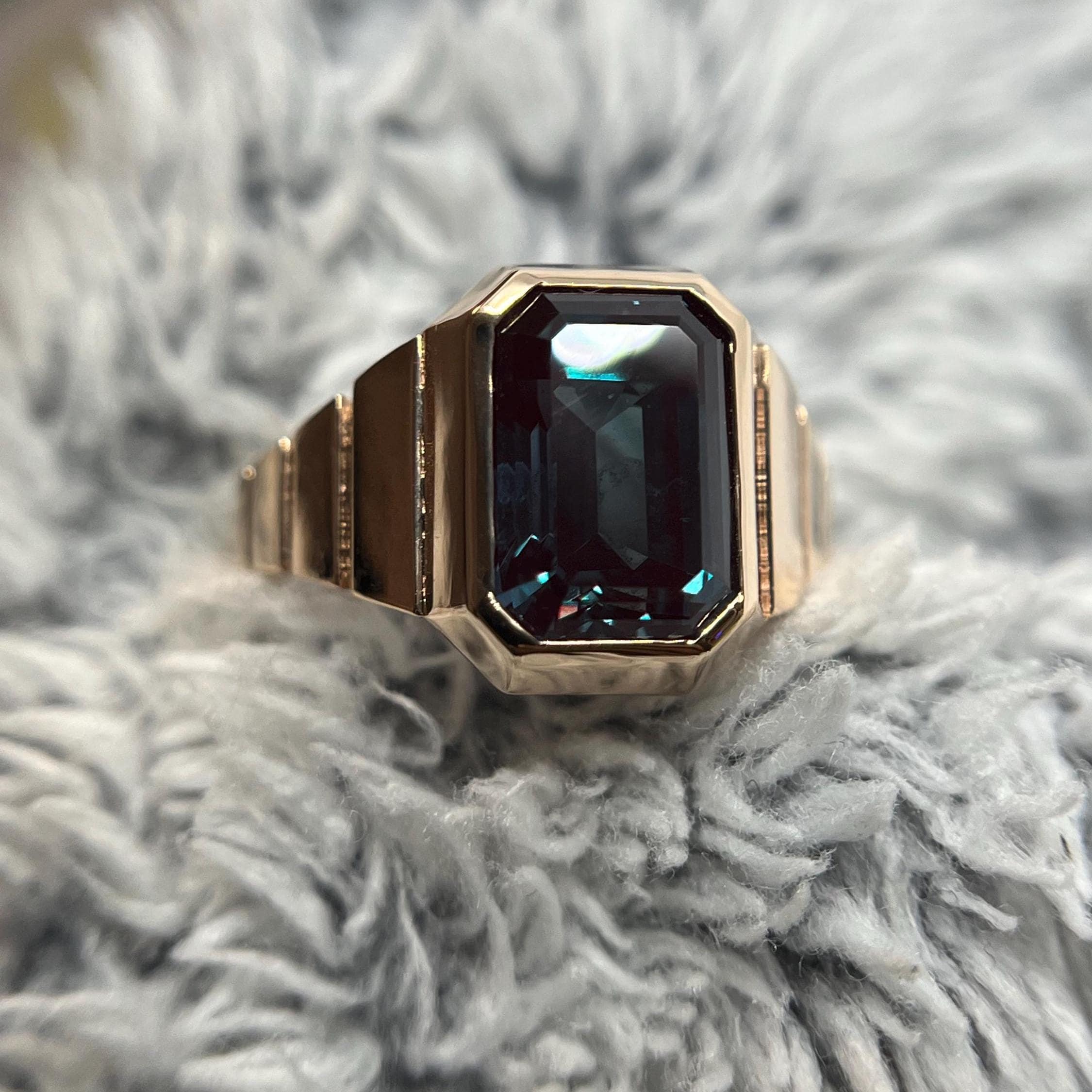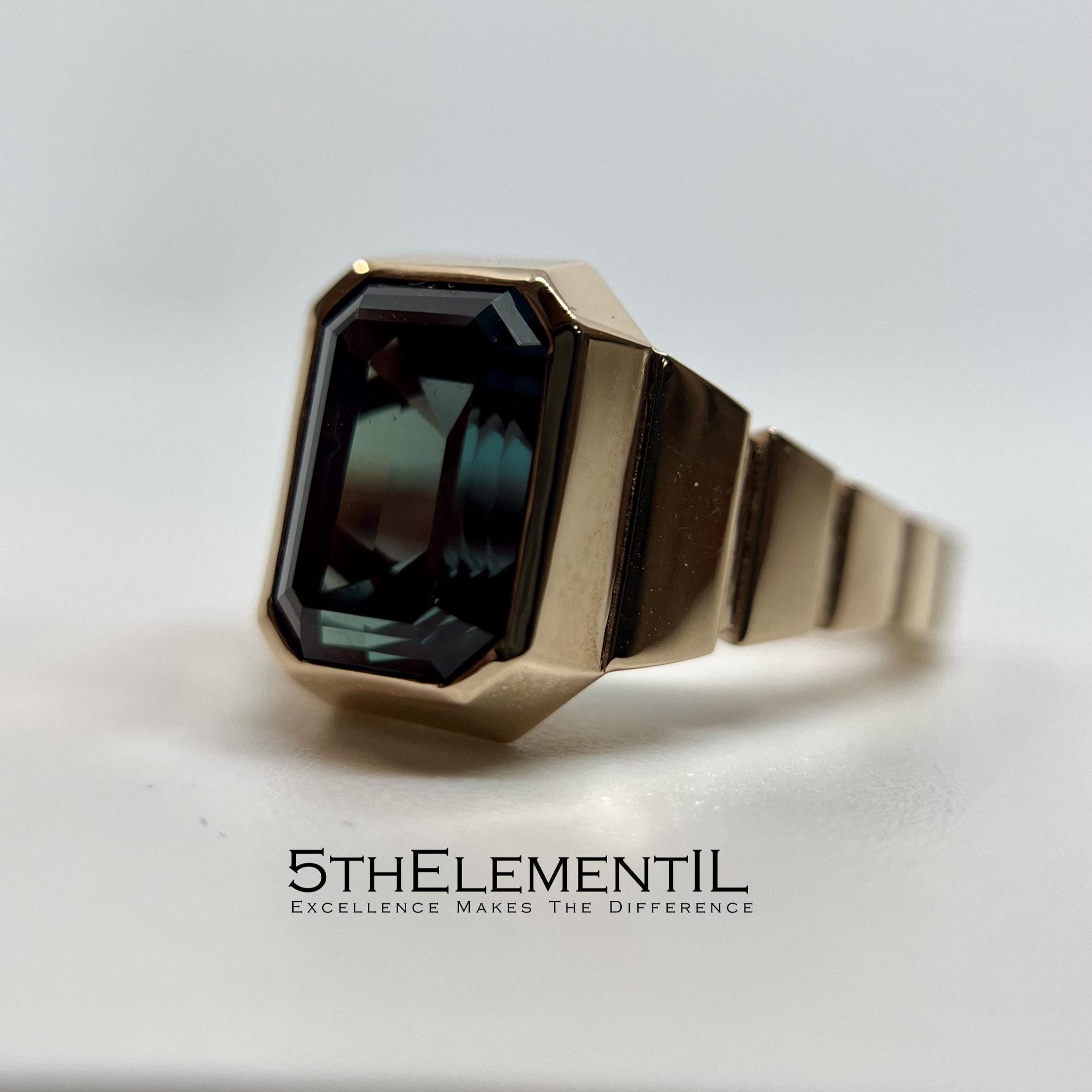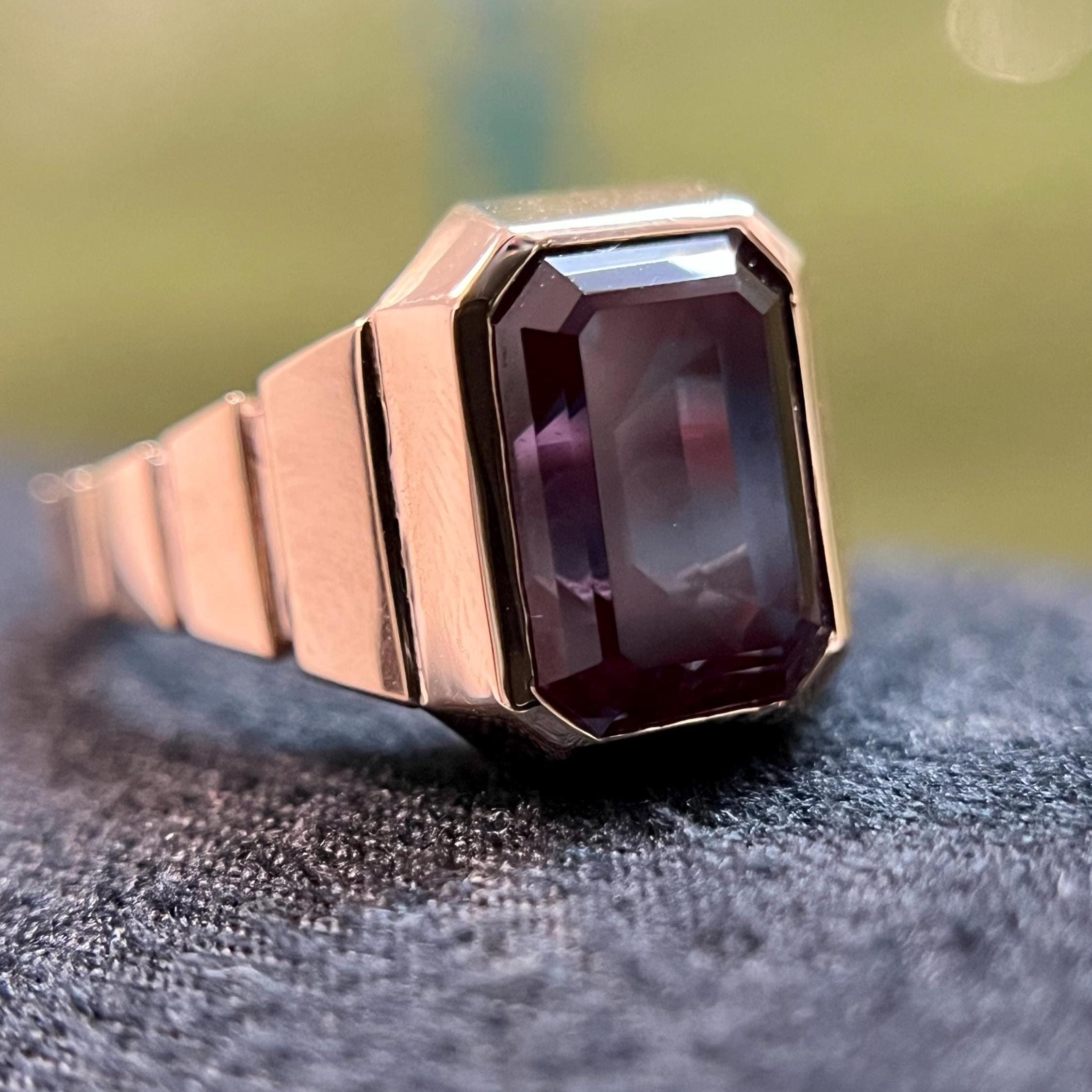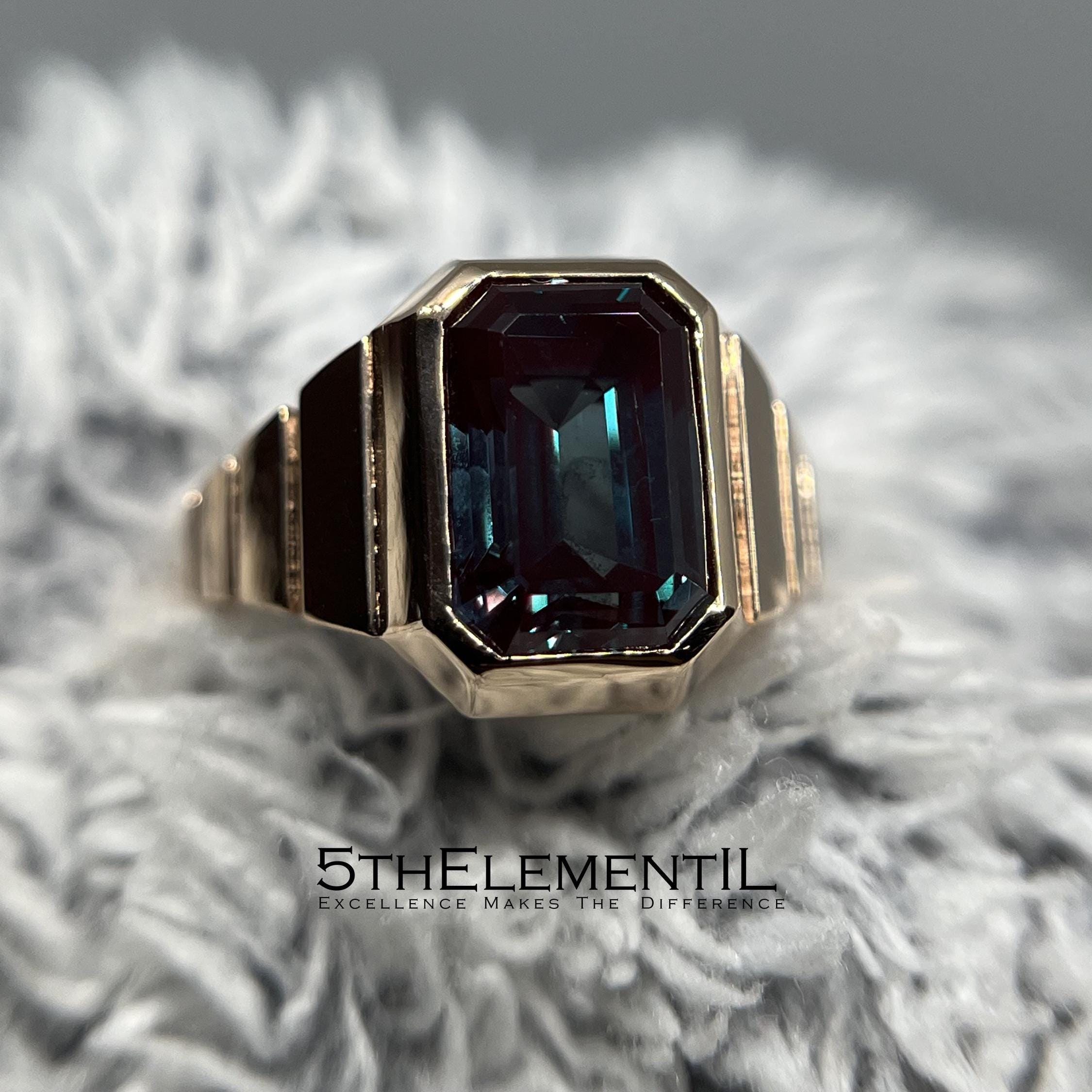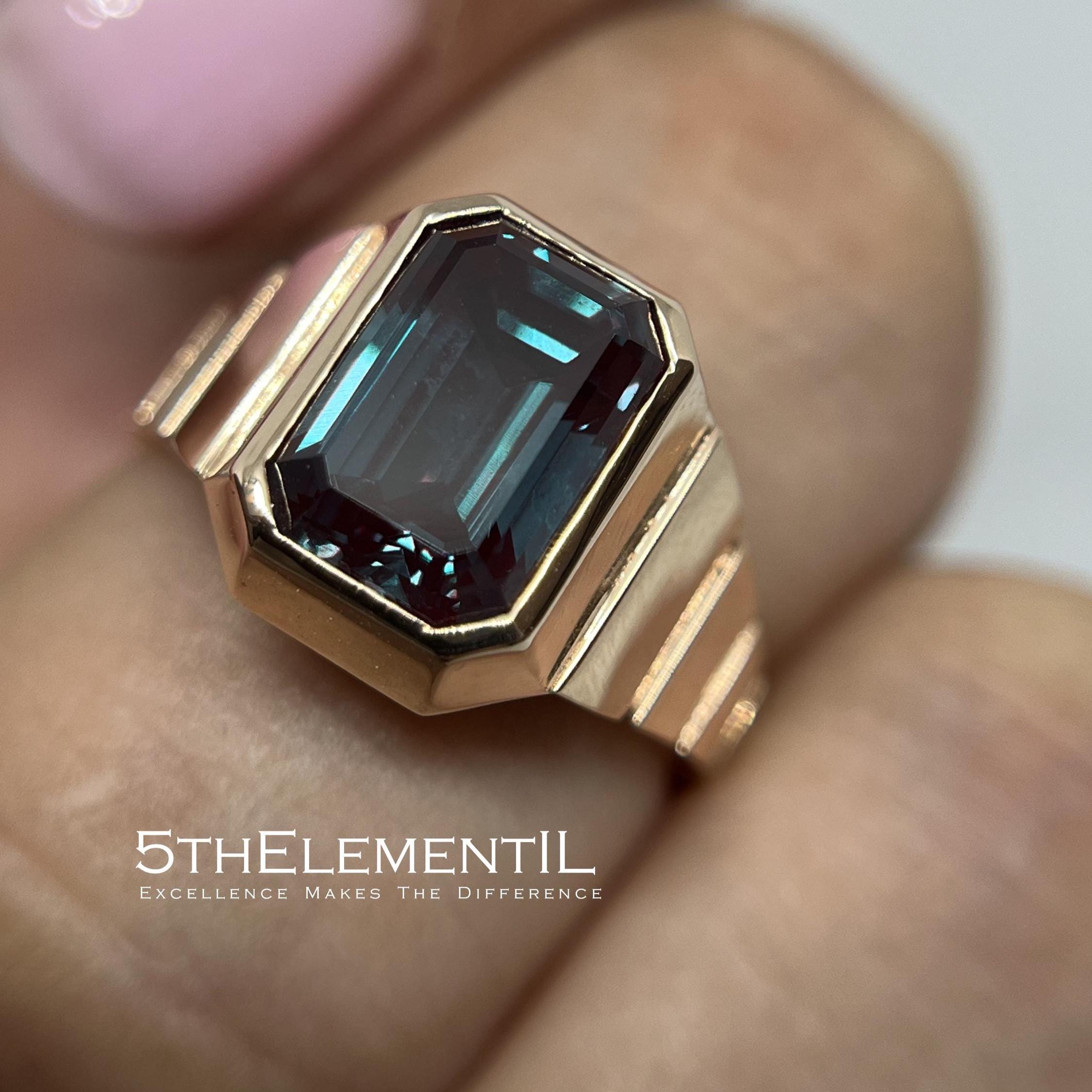 This stunning handmade ring features a 4-carat lab-grown alexandrite with a mesmerizing emerald (octagon) cut, set in luxurious 14K solid rose gold. Known for its remarkable color-changing ability, this alexandrite shifts from a deep bluish-green in daylight to a vivid reddish-purple under warm light — a true statement of elegance and mystery.