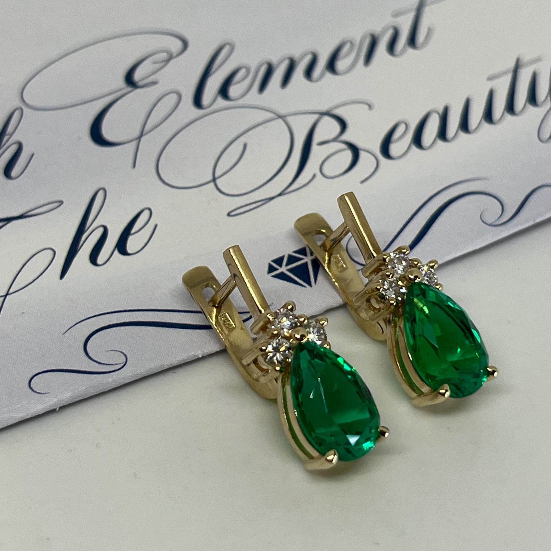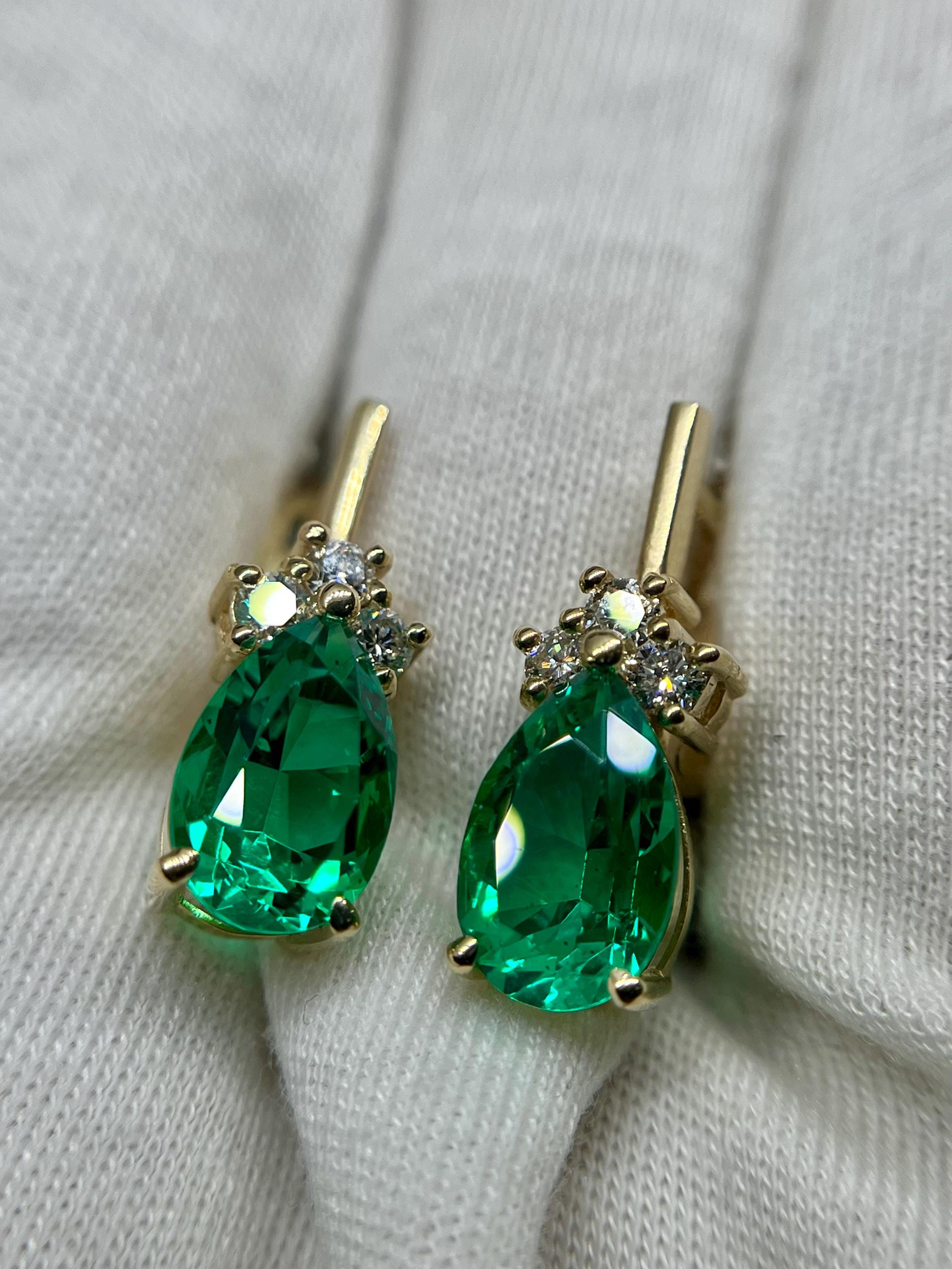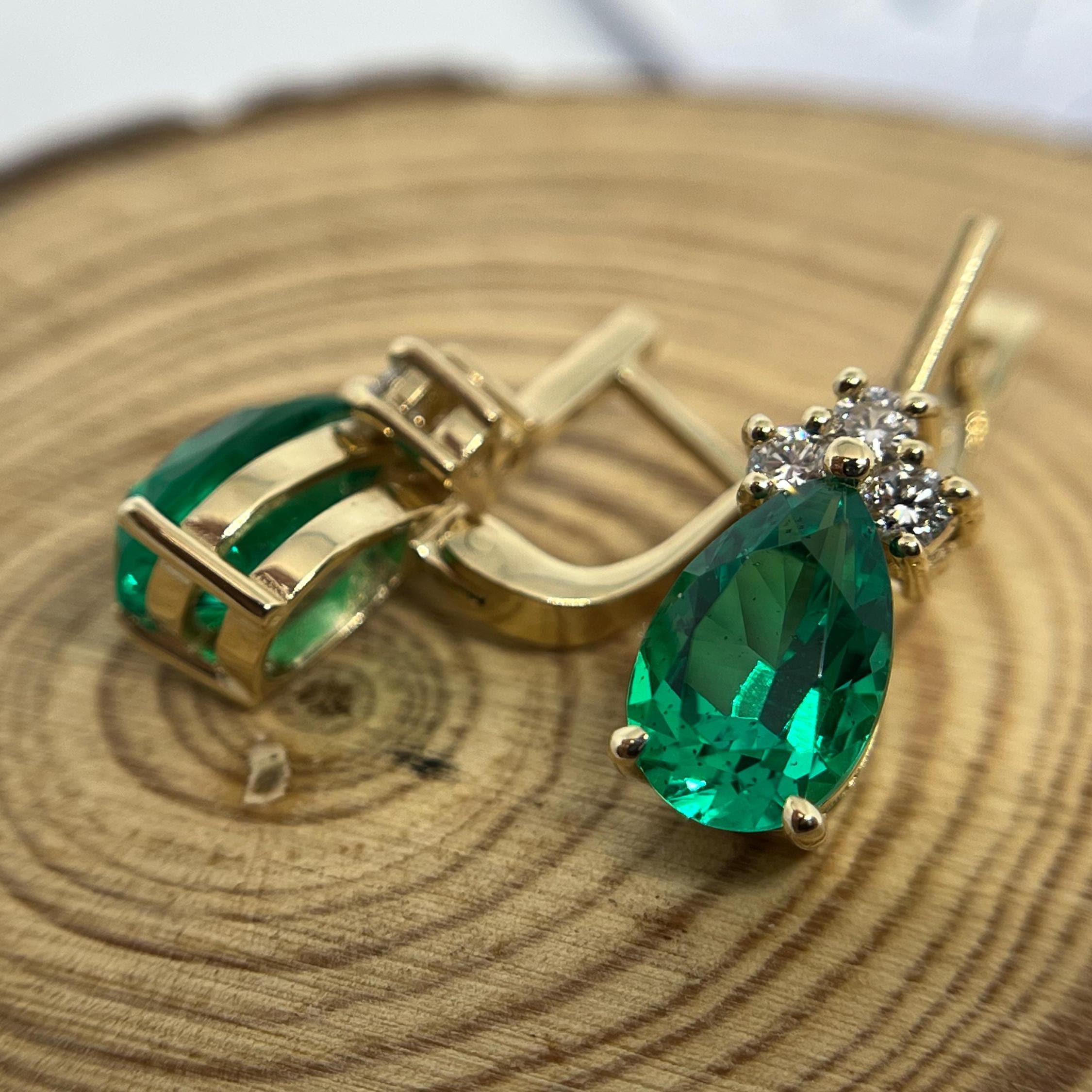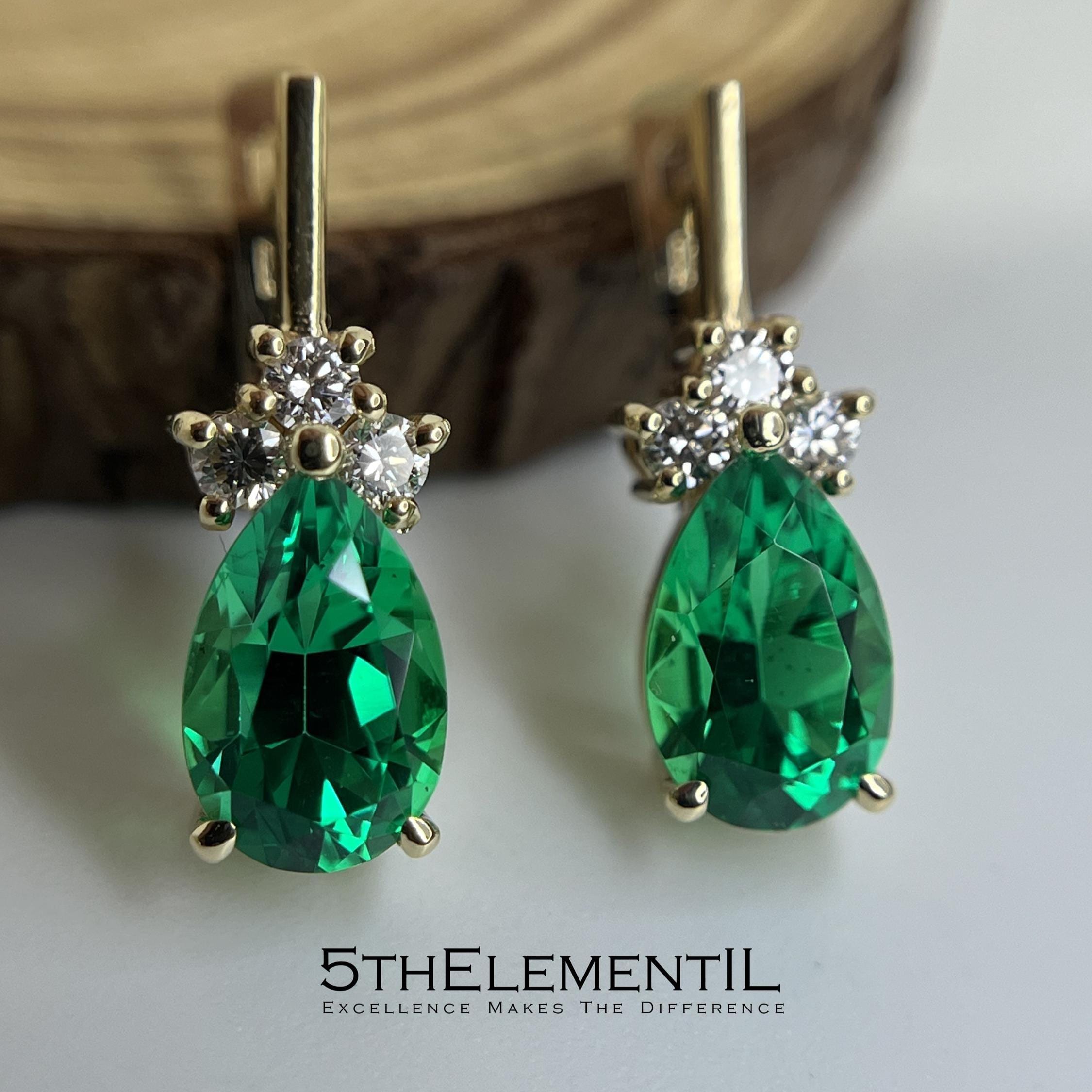 14K Gold Emerald Earrings, Teardrop Lab Grown Diamond Jewelry