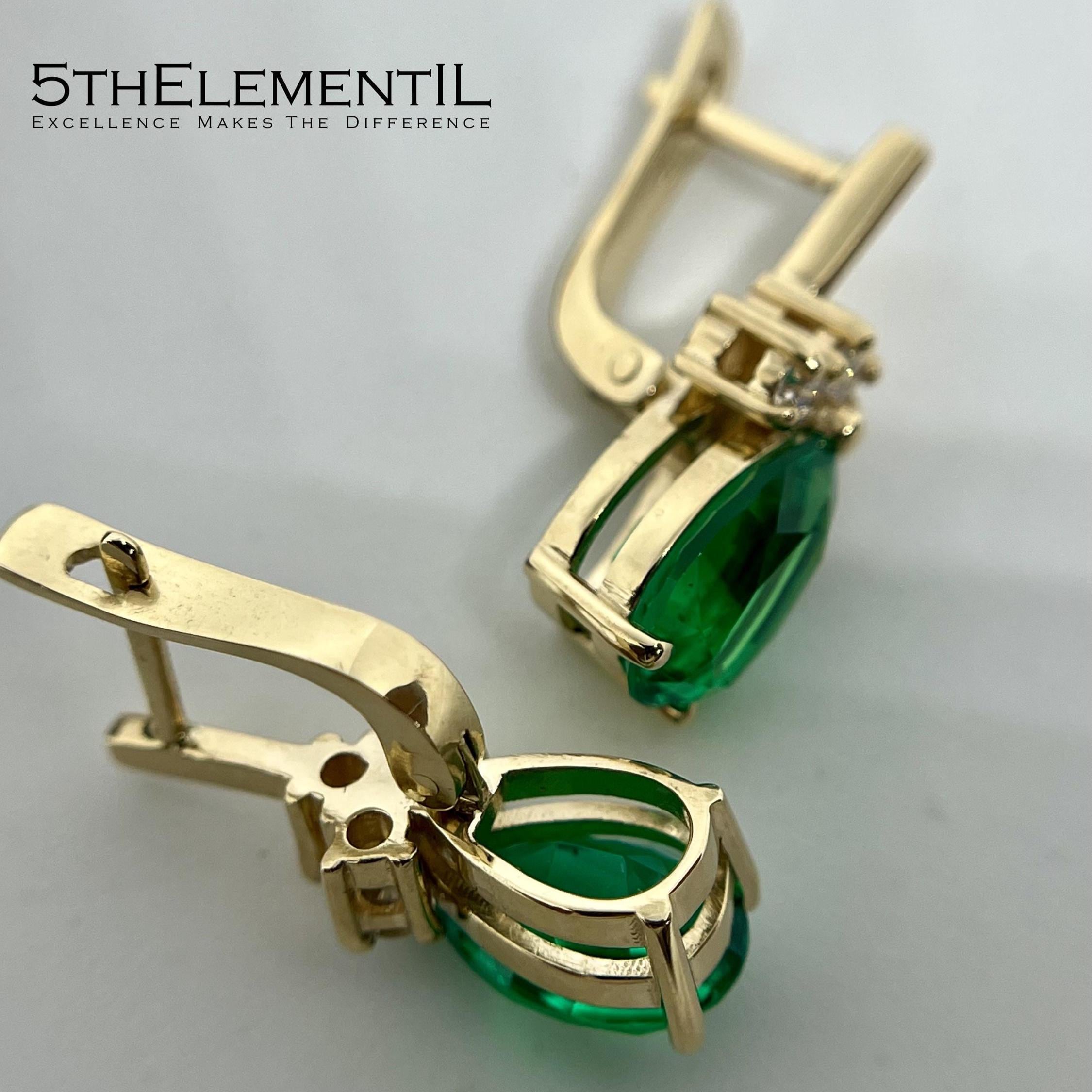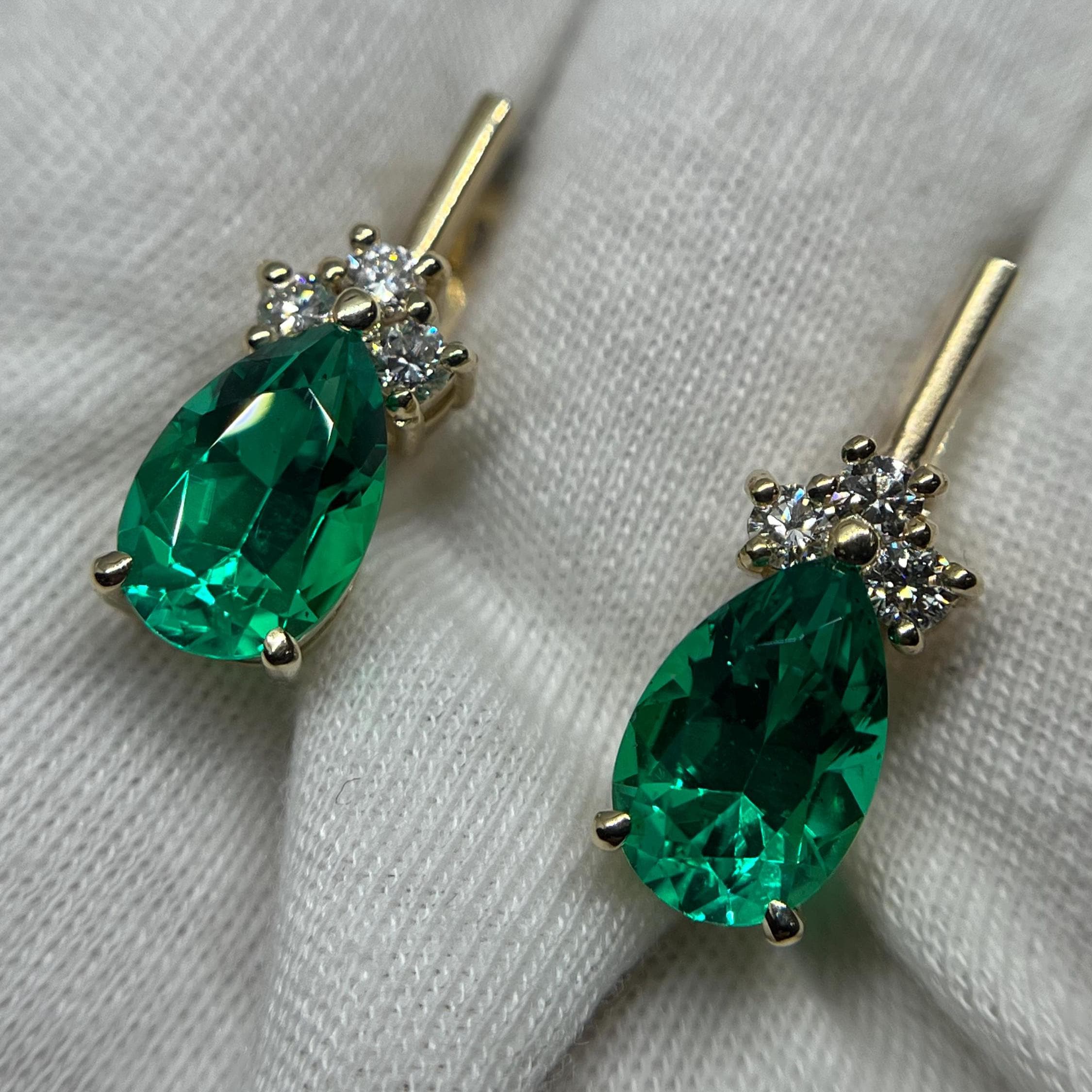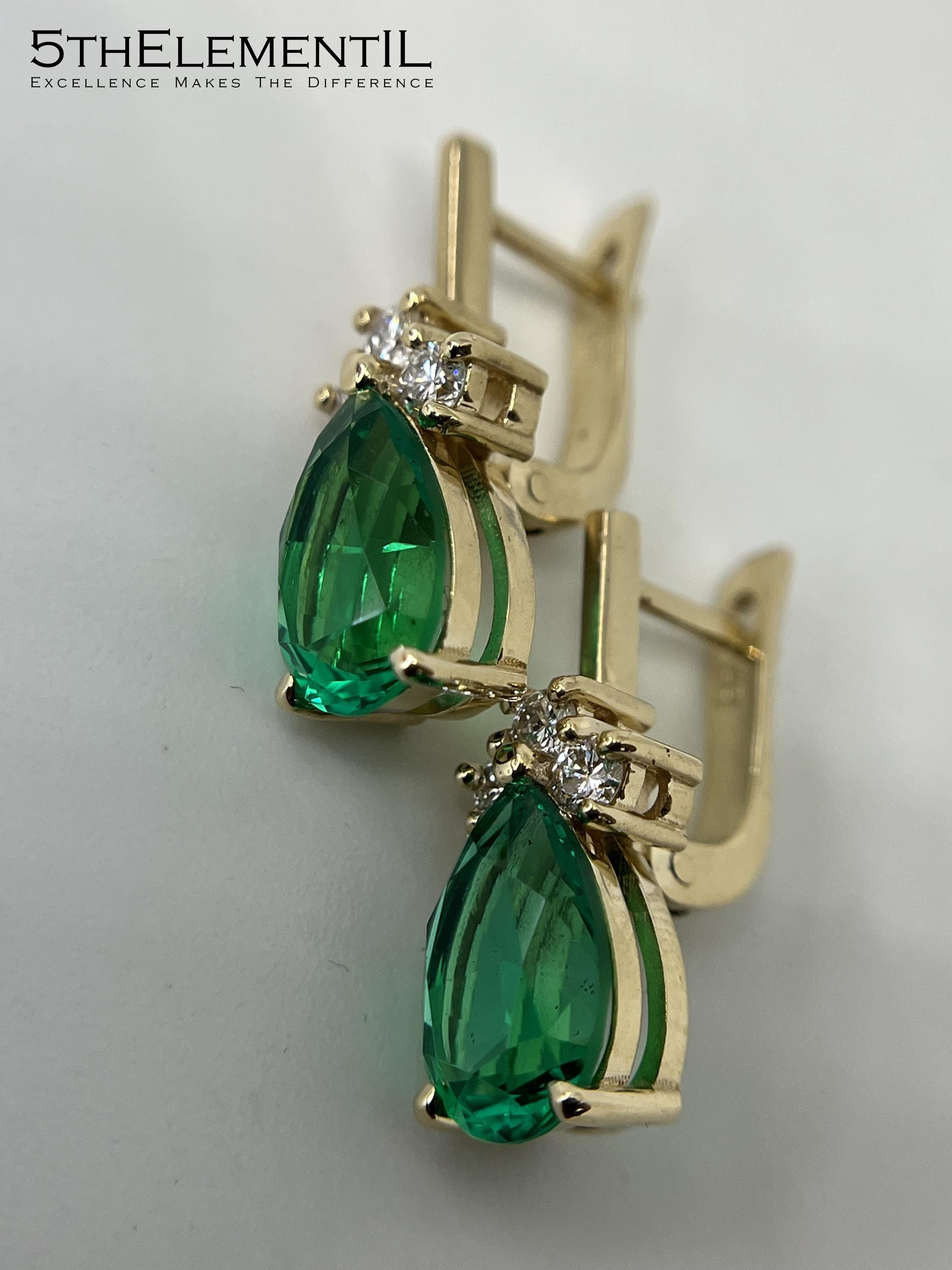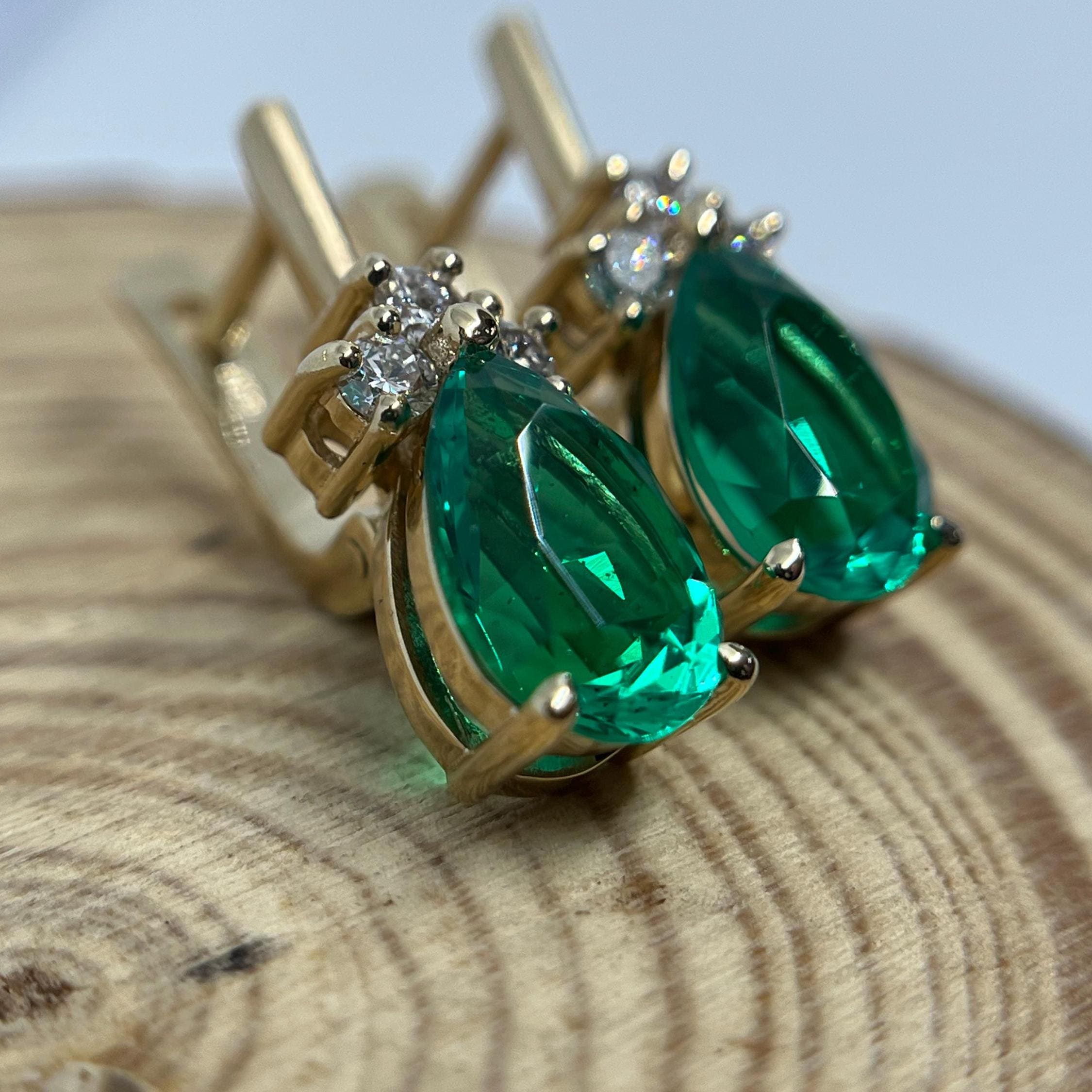 14K Gold Emerald Earrings, Teardrop Lab Grown Diamond Jewelry