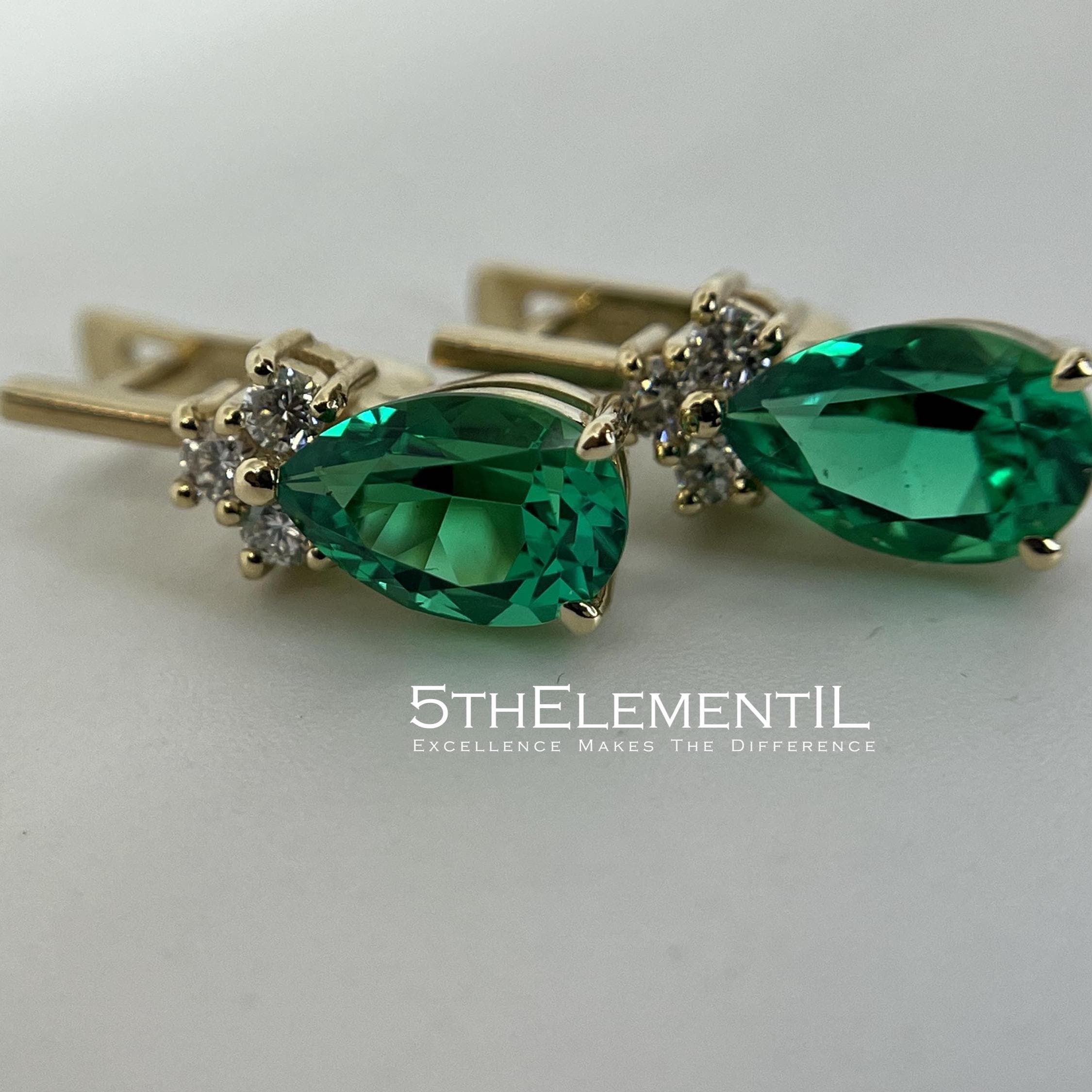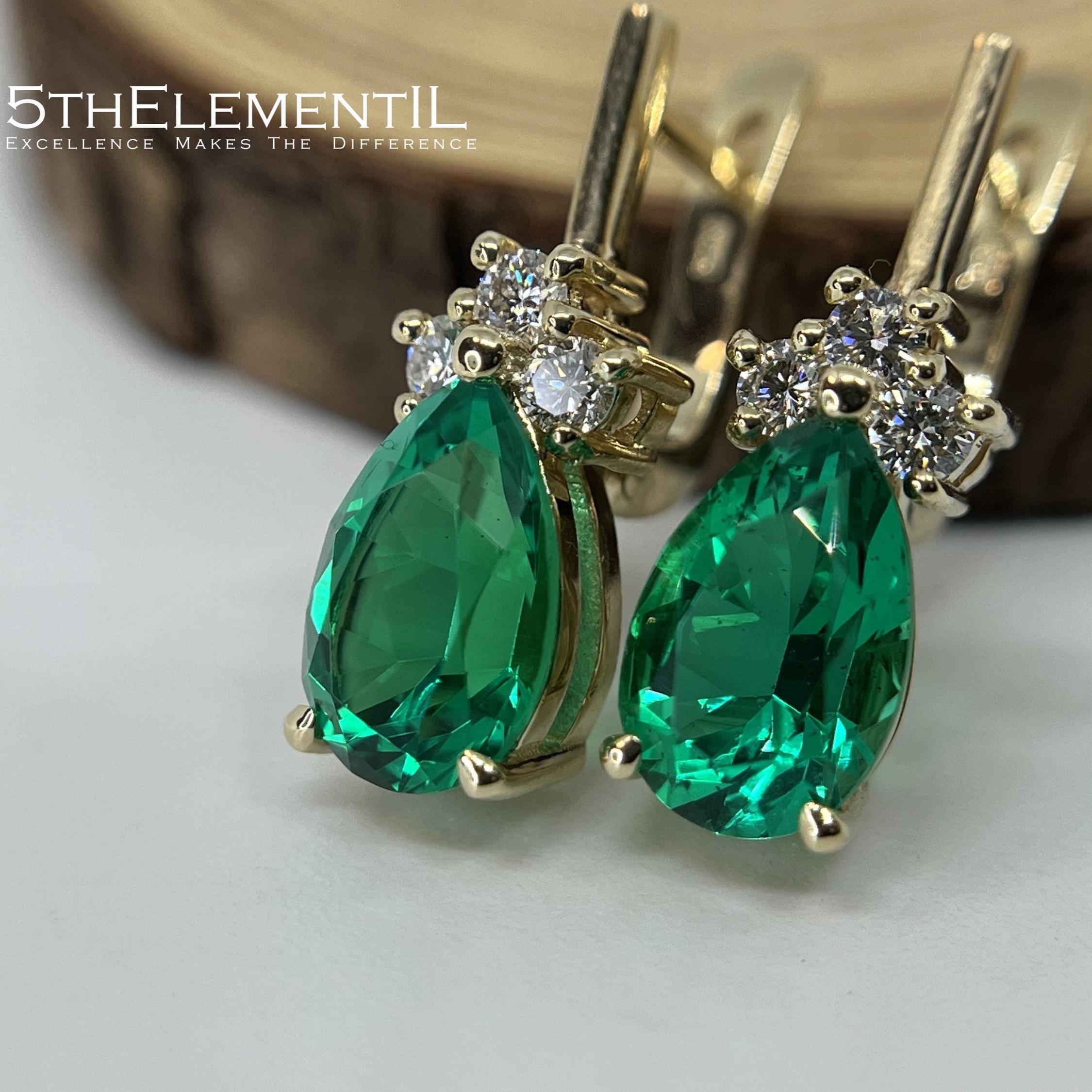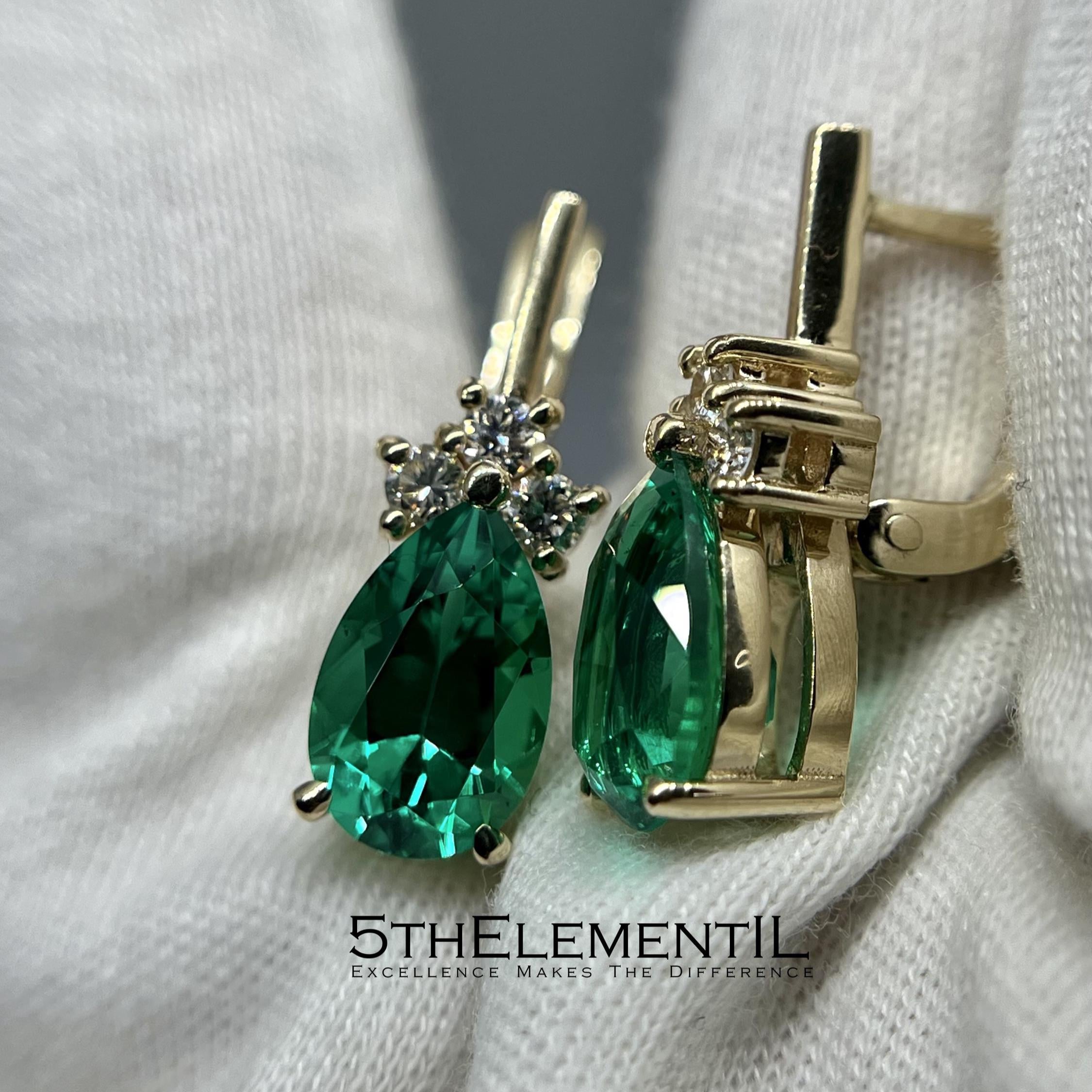Colombian emerald grown by hydrothermal method in the leading lab in the world ( Tairus facilities ) pear cut. Solid gold 14k and 6 lab grown diamonds of highest quality. Together with passion and world-class professionalism of our jewelry team - we are glad to offer you this absolutely stunning pair of unique earrings. It might definitely become a matter of pride for long years and catch its small corner in the family heil-room.