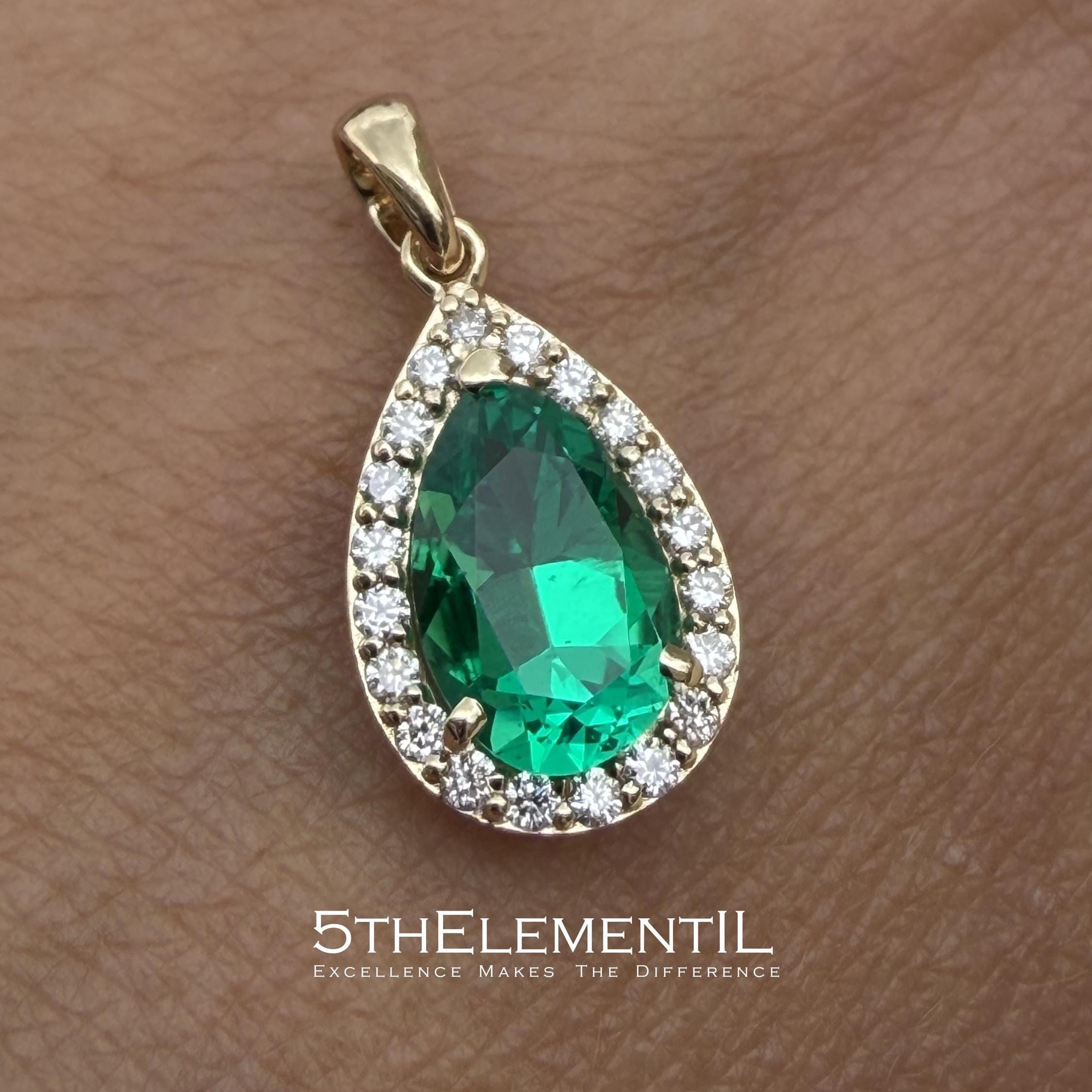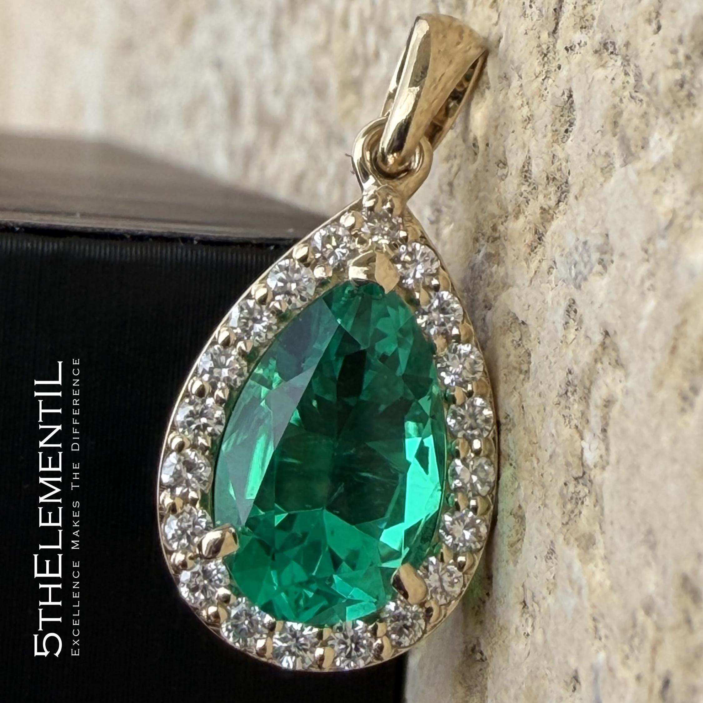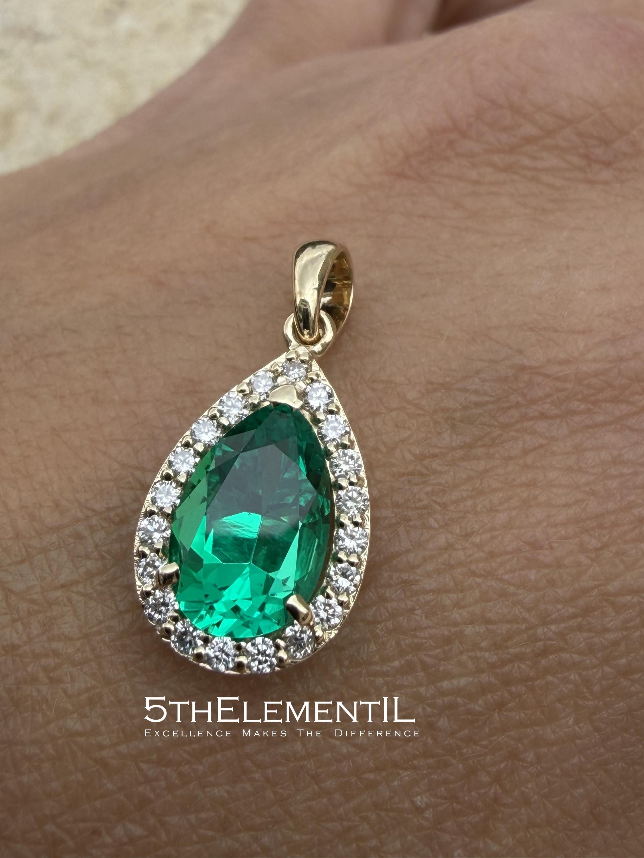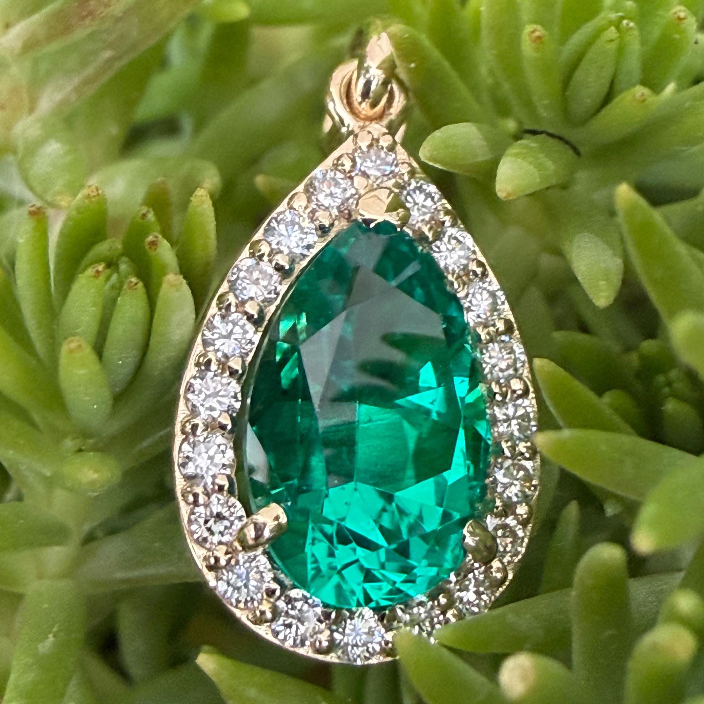 Gold Emerald Pendant With Diamond Halo. Hydrothermal Lab Grown Gemstone Jewelry.