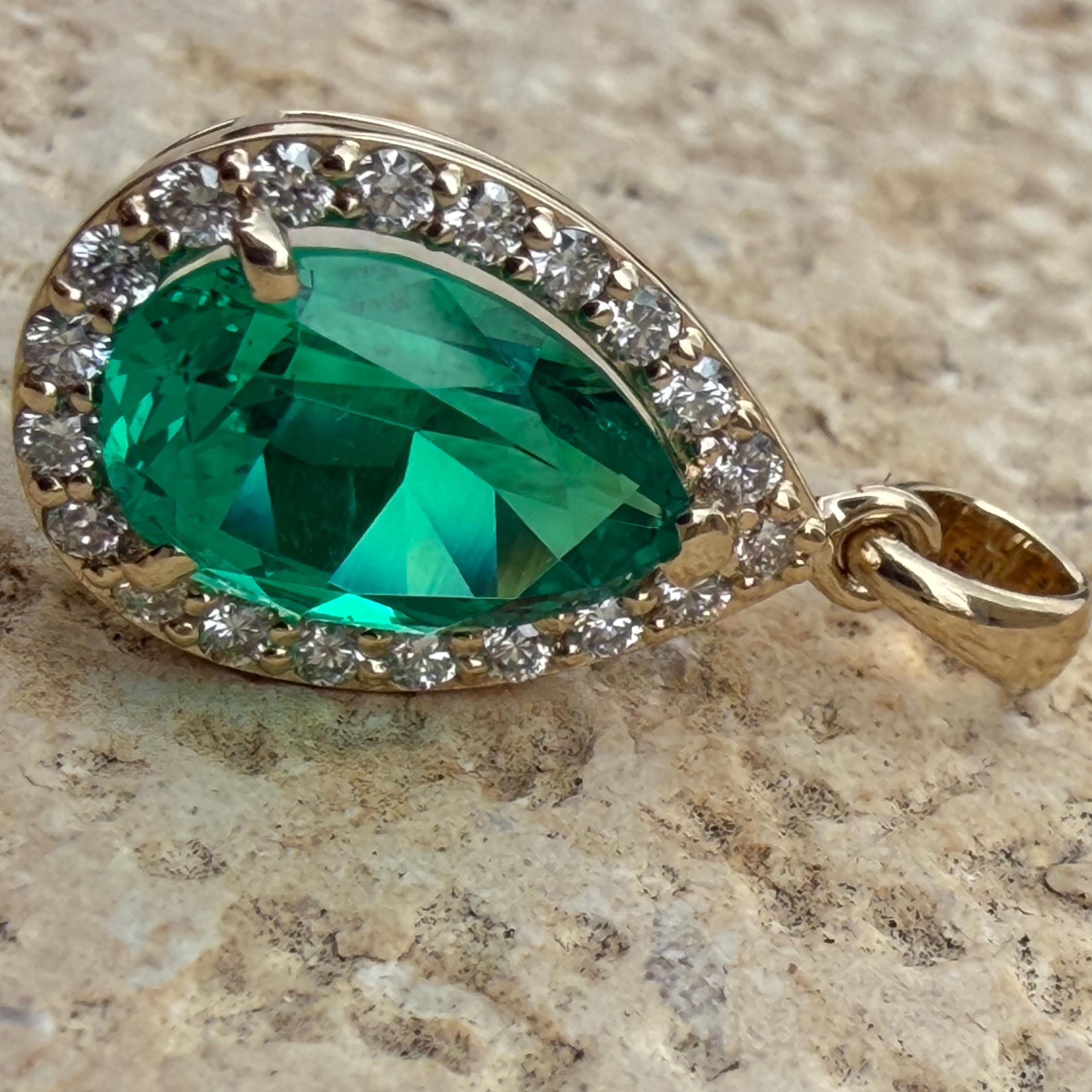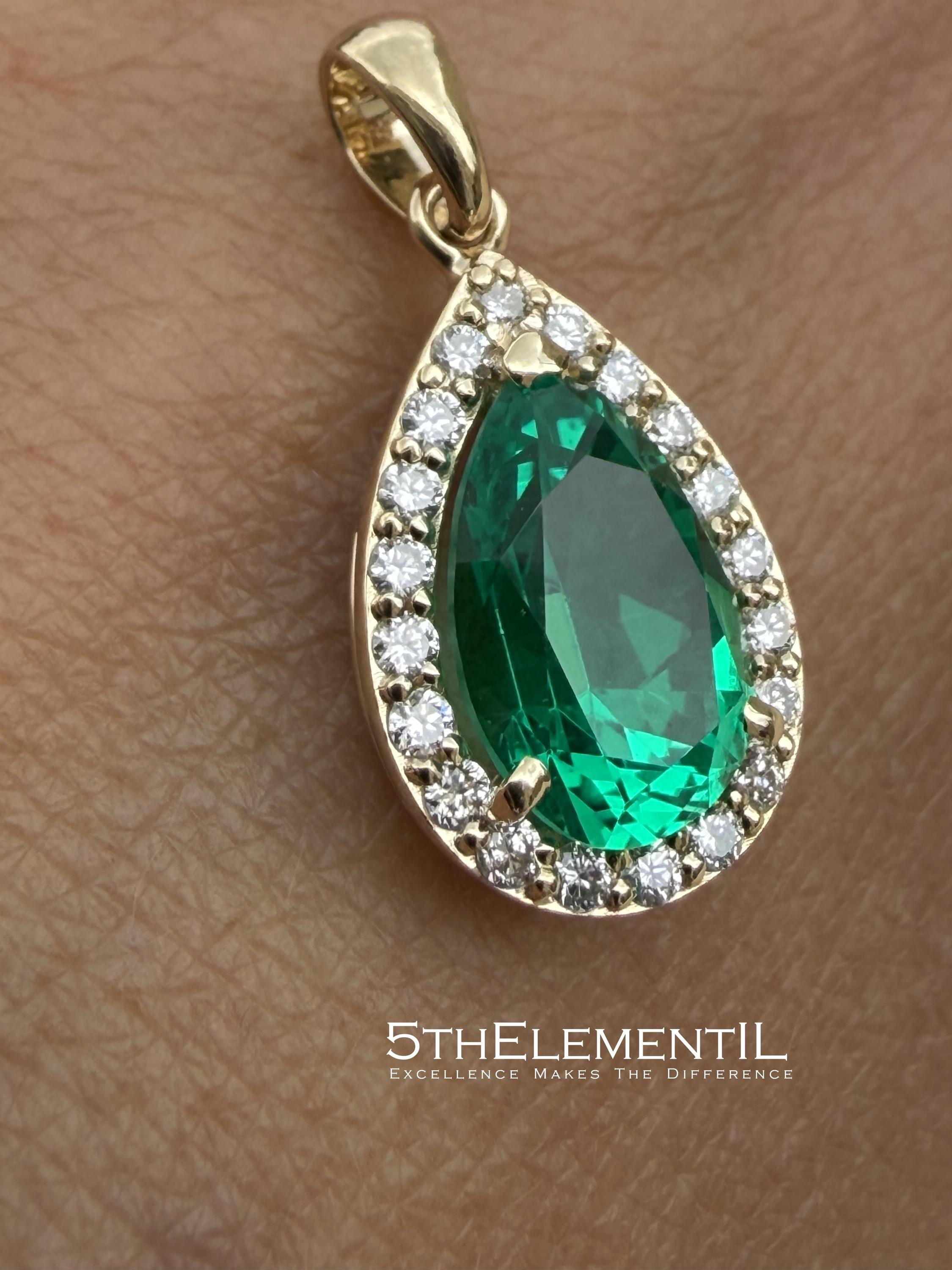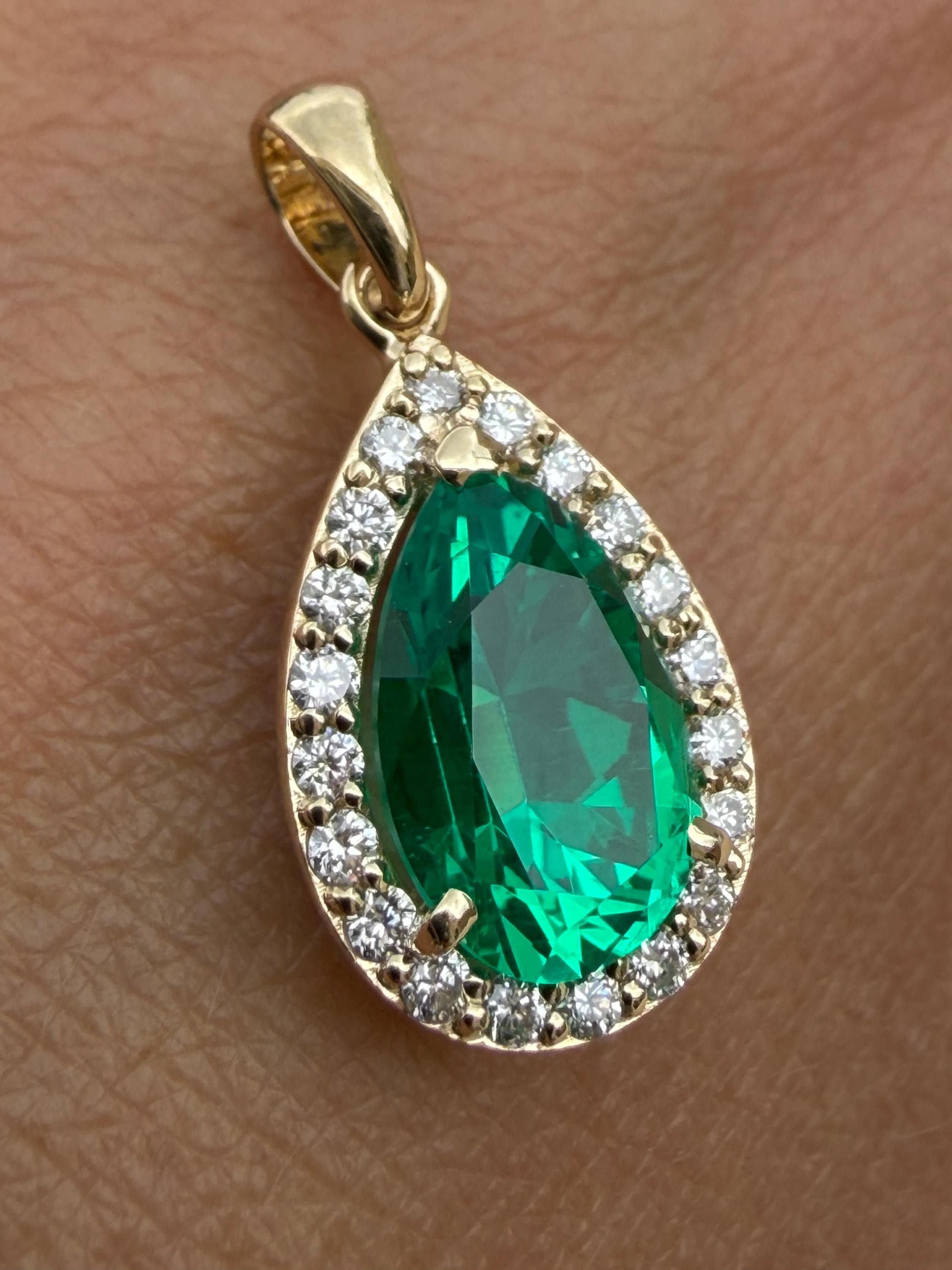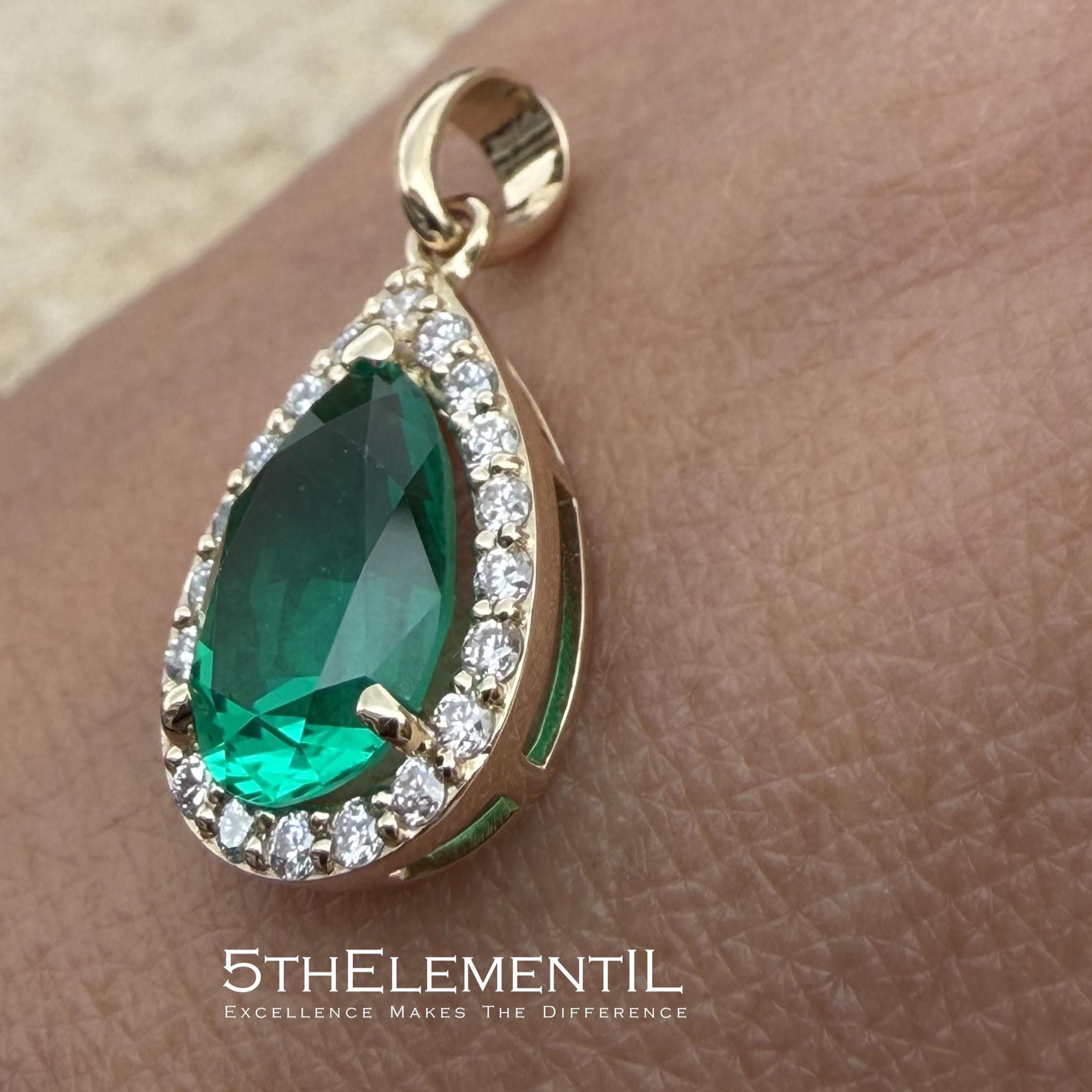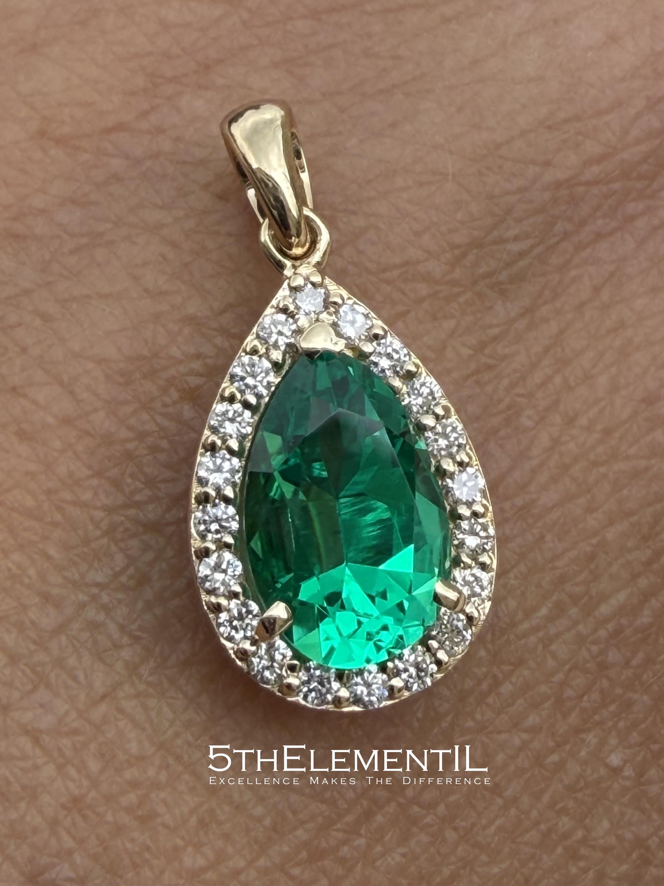 Gold Emerald Pendant With Diamond Halo. Hydrothermal Lab Grown Gemstone Jewelry.